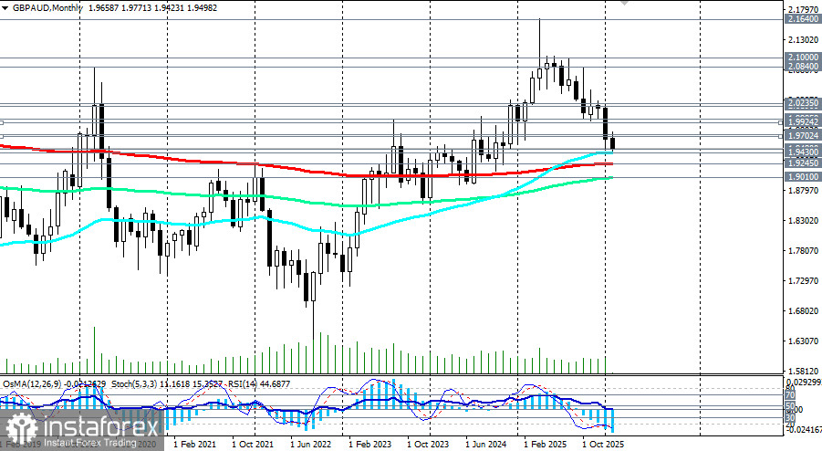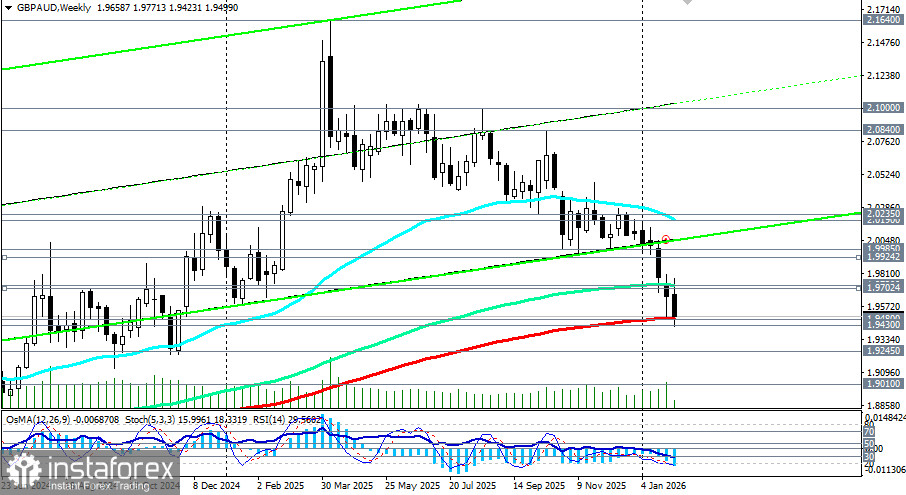 Очевидно, что с технической точки зрения, преобладает негативная динамика. Пробой уровней поддержки 1.9480, 1.9430 (ЕМА50 на месячном графике) может спровоцировать дальнейшее снижение в сторону стратегических уровней поддержки 1.9245 (ЕМА144 на месячном графике), 1.9010 (ЕМА200 на месячном графике), пробой которых, в свою очередь, окончательно сломает бычий тренд пары, берущий начало в июне 2023 года с пробоя отметки 1.9040, через которую на тот момент проходил стратегический уровень сопротивления - ЕМА200 на месячном графике.