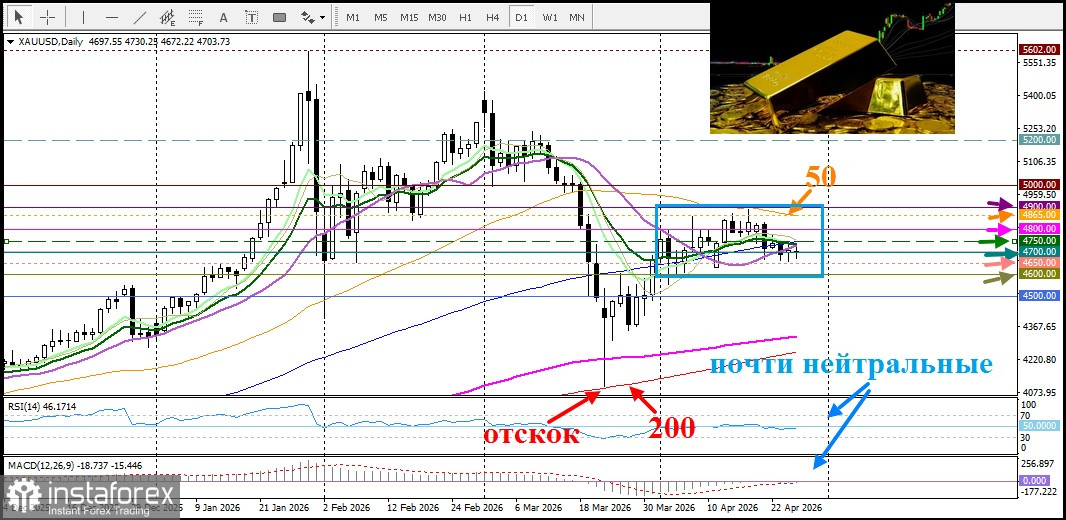 В то же время сопротивление расположено в районе $4750, далее - около $4800 и в зоне $4865-4900, соответствующей верхней границе текущего диапазона и 50-дневной SMA. Прорыв этой зоны станет подтверждением возобновления восходящего тренда и откроет путь к движению выше психологического уровня $5000.