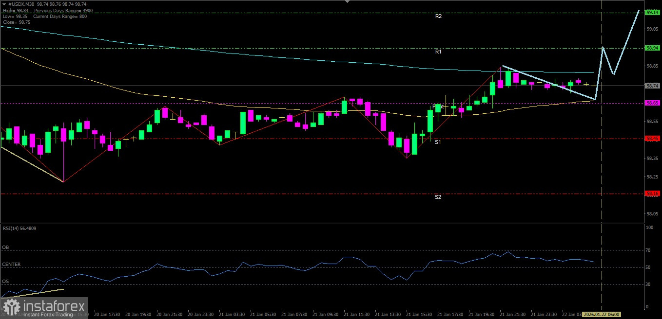 Zona Reaksi Positif: Jika harga bertahan di atas level 98.65, maka kemungkinan #USDX akan bergerak naik menuju 98.94
