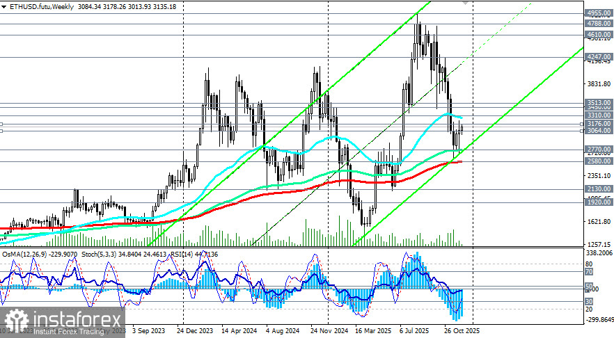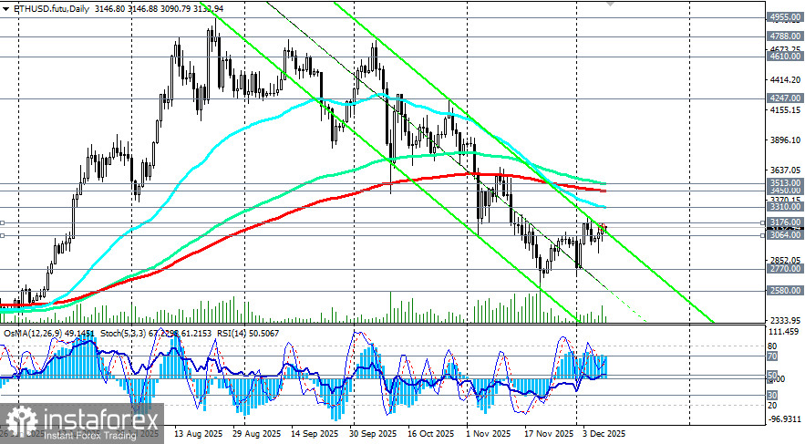 Между отметками 3064.00 и 3176.00 также проходит верхняя граница нисходящего канала на дневном графике. Пробой уровня поддержки 3064.00 может стать, таким образом, сигналом для новых коротких позиций с целями на важных долгосрочных уровнях поддержки 2770.00 (ЕМА144 на недельном графике), 2580.00 (ЕМА200 на недельном графике и нижняя граница нисходящего канала на дневном графике).