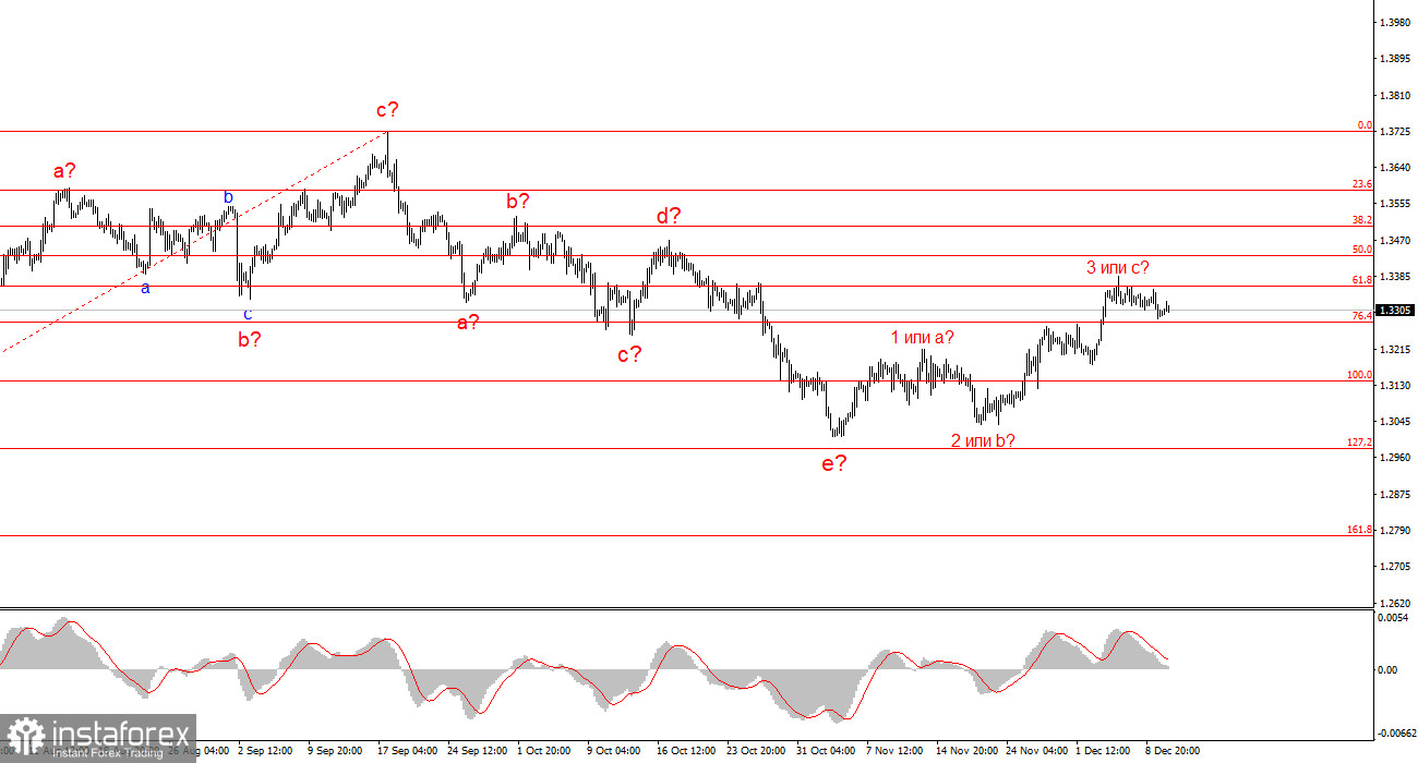 В краткосрочном плане я ожидал построение волны 3 или с с целями, расположенными около отметок 1,3280 и 1,3360, что приравнивается к 76,4% и 61,8% по Фибоначчи. Эти цели достигнуты. Волна 3 или с может продолжить свое построение, но текущий набор волн, вероятнее всего, опять коррекционный. Следовательно, снижение на этой неделе возможно, а попытка прорыва отметки 1,3360 оказалась неудачной.