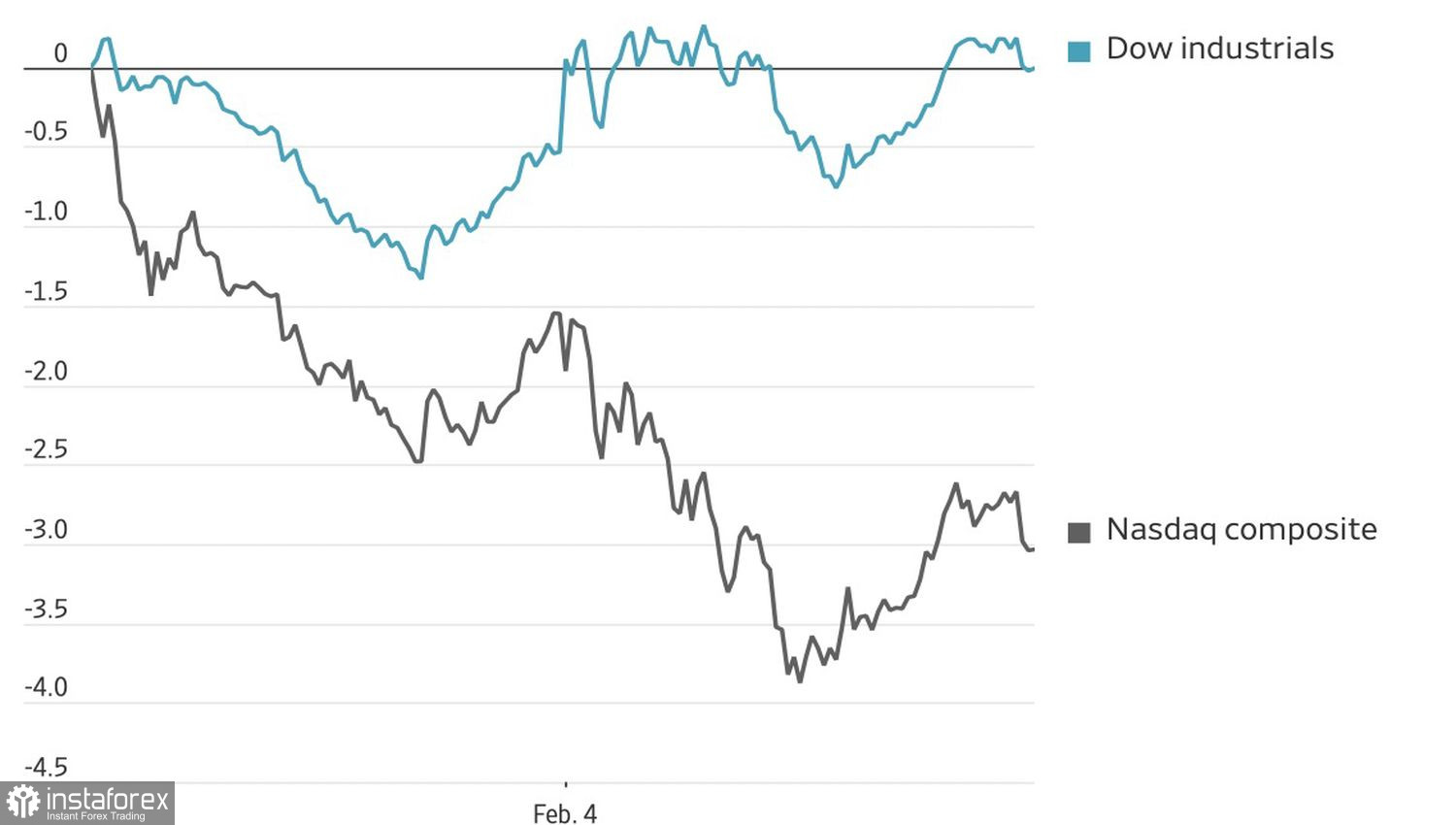 В аутсайдерах оказались не только компании производители программного обеспечения, но даже технологические гиганты. Так, акции Meta Platforms просели почти на 7% с начала недели, NVIDIA – почти на 9%. Казалось бы, какое они имеют отношение к новому продукту Anthropic? По факту эти бумаги продаются, чтобы уменьшить кровотечение от связанных с другими эмитентами убытков. В итоге индекс Доу-Джонса закономерно превосходит Nasdaq Composite.