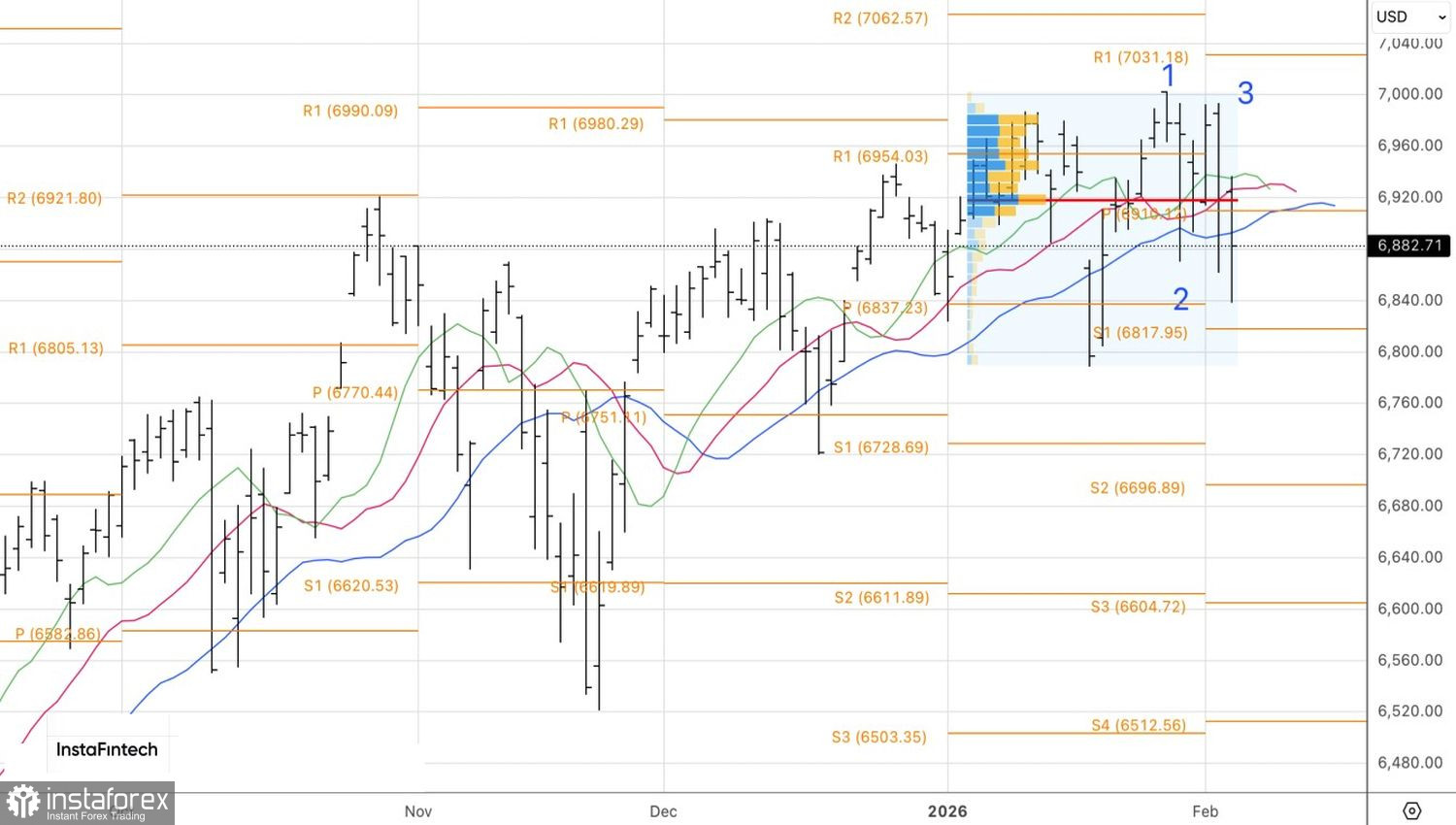 Технически на дневном графике S&P 500 «медведи» пытаются реализовать разворотный паттерн 1-2-3. Однако судьба широкого фондового индекса по-прежнему зависит от вопроса, за кем останется справедливая стоимость на 6920? Рост котировок выше нее позволит вернуться к лонгам.