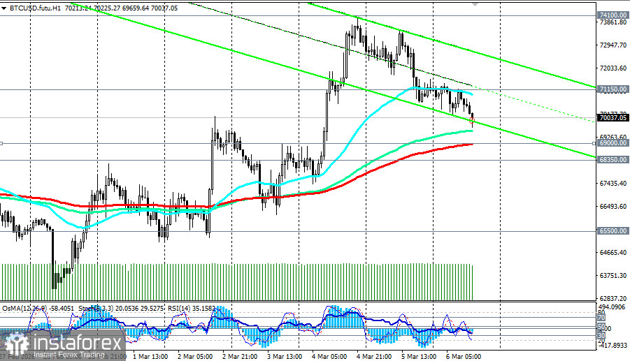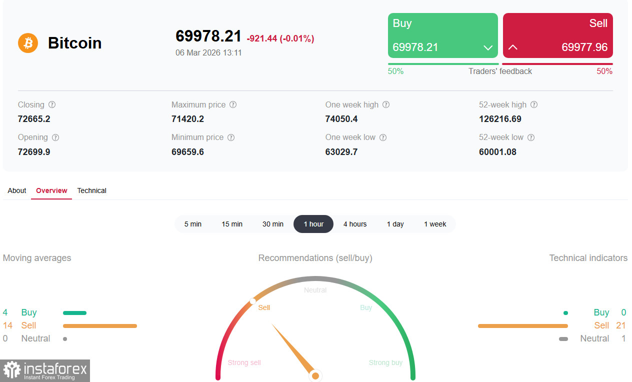 Ключевая зона 69000.00-71000.00 станет решающей в ближайшие дни. Удержание этого уровня позволит «быкам» нацелиться на повторный тест 74000.00, тогда как пробой откроет дорогу к более глубокой коррекции в зону 65500.00-63500.00. При любом сценарии волатильность останется высокой, и инвесторам следует проявлять осторожность, рассматривая текущие уровни, скорее, как зону повышенного риска, чем как точку для агрессивных ставок. Успех будет на стороне тех, кто сможет отделить краткосрочный шум от долгосрочных трендов и дождаться прояснения ключевых факторов — исхода ближневосточного конфликта, данных по инфляции и регуляторных решений.