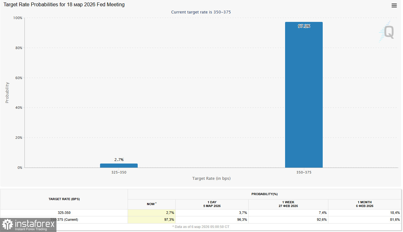 Рост цен на энергоносители возобновил инфляционные опасения. Согласно инструменту CME FedWatch, вероятность снижения ставки на мартовском заседании упала до 2,7% (с 7,4% неделей ранее), а к апрелю — до 12,8%. Члены ФРС все чаще заявляют о необходимости паузы для оценки влияния конфликта на экономику.