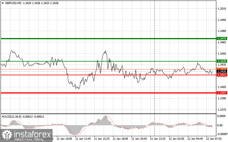 Сценарий №2: покупать фунт сегодня также планирую в случае двух подряд тестов цены 1.3421 в момент, когда индикатор MACD будет находиться в области перепроданности. Это ограничит нисходящий потенциал пары и приведет к обратному развороту рынка вверх. Можно ожидать рост к противоположным уровням 1.3439 и 1.3470.