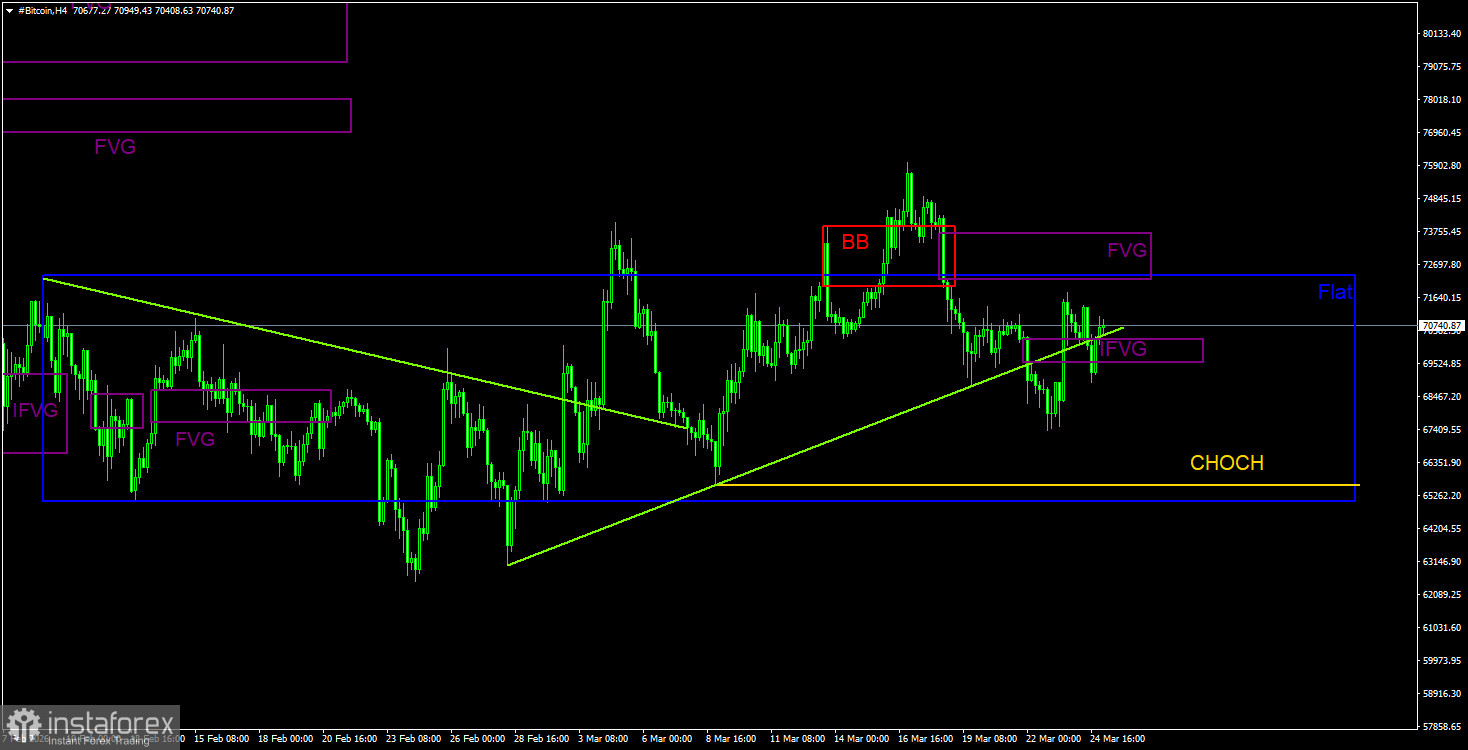 На 4-часовом таймфрейме цена завершила 5-недельный флэт, однако тренд пока не начался. Линия CHOCH, которая является опорой для восходящей коррекции, пролегает на уровне 65 500$. Преодоление этой линии укажет на завершение коррекции, которая длится уже больше месяца. Order-block был импульсно пробит, Breaker-block был импульсно пробит, сигналов сформировано не было, флэт нельзя считать актуальным в данное время, краткосрочную восходящую тенденцию нельзя считать завершенной, понижательное настроение на рынке сохраняется. Последний «медвежий» FVG был отменен после выступления Трампа, сформированные на его базе IFVG тоже не дал ощутимой реакции.