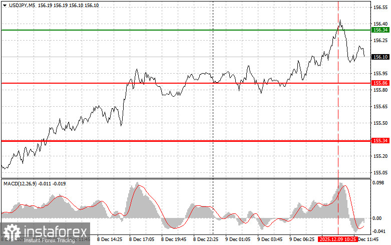 การทดสอบราคาที่ 156.34 เกิดขึ้นเมื่ออินดิเคเตอร์ MACD ได้เคลื่อนไหวขึ้นไปสูงกว่าเส้นศูนย์แล้วซึ่งจำกัดความสามารถในการขึ้นของคู่สกุลนี้ ด้วยเหตุนี้ ฉันจึงไม่ซื้อดอลลาร์