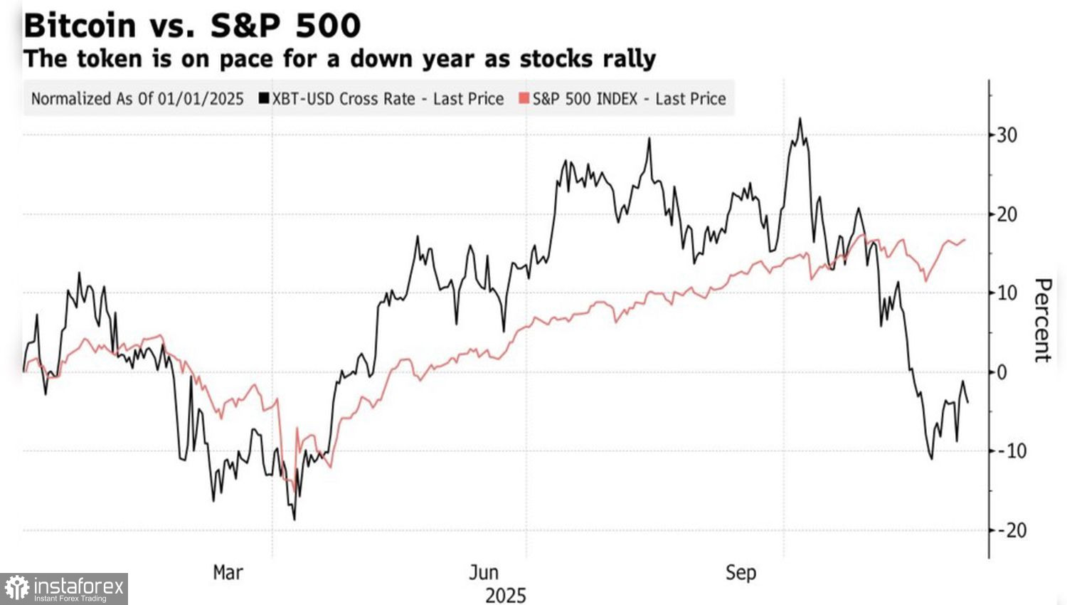 08.12.2025 13:02В мире, где все постоянно меняется, глупо рассчитывать на стабильность. Биткойн стоит на пороге того, что впервые с 2014 его путь с американскими акциями может разойтись. S&P 500 вырос на 16% с начала января, котировки BTC/USD просели на 3% за этот же период. Да, до конца года осталось немало времени, однако особенностью 2025 стал разрыв цифровых активов с глобальным аппетитом к риску.