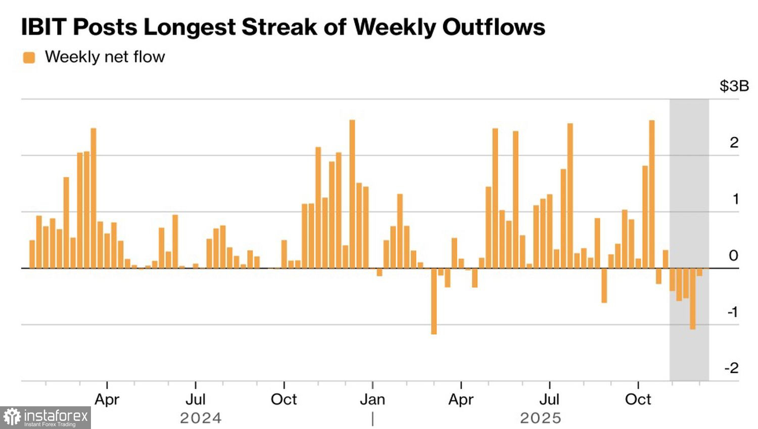 За пять недель до 28 ноября инвесторы забрали из него $2,7 млрд. Отток продолжился и на шестой неделе. При этом его наличие на фоне попыток BTC/USD восстановиться, говорит о ненадежности ралли токена.