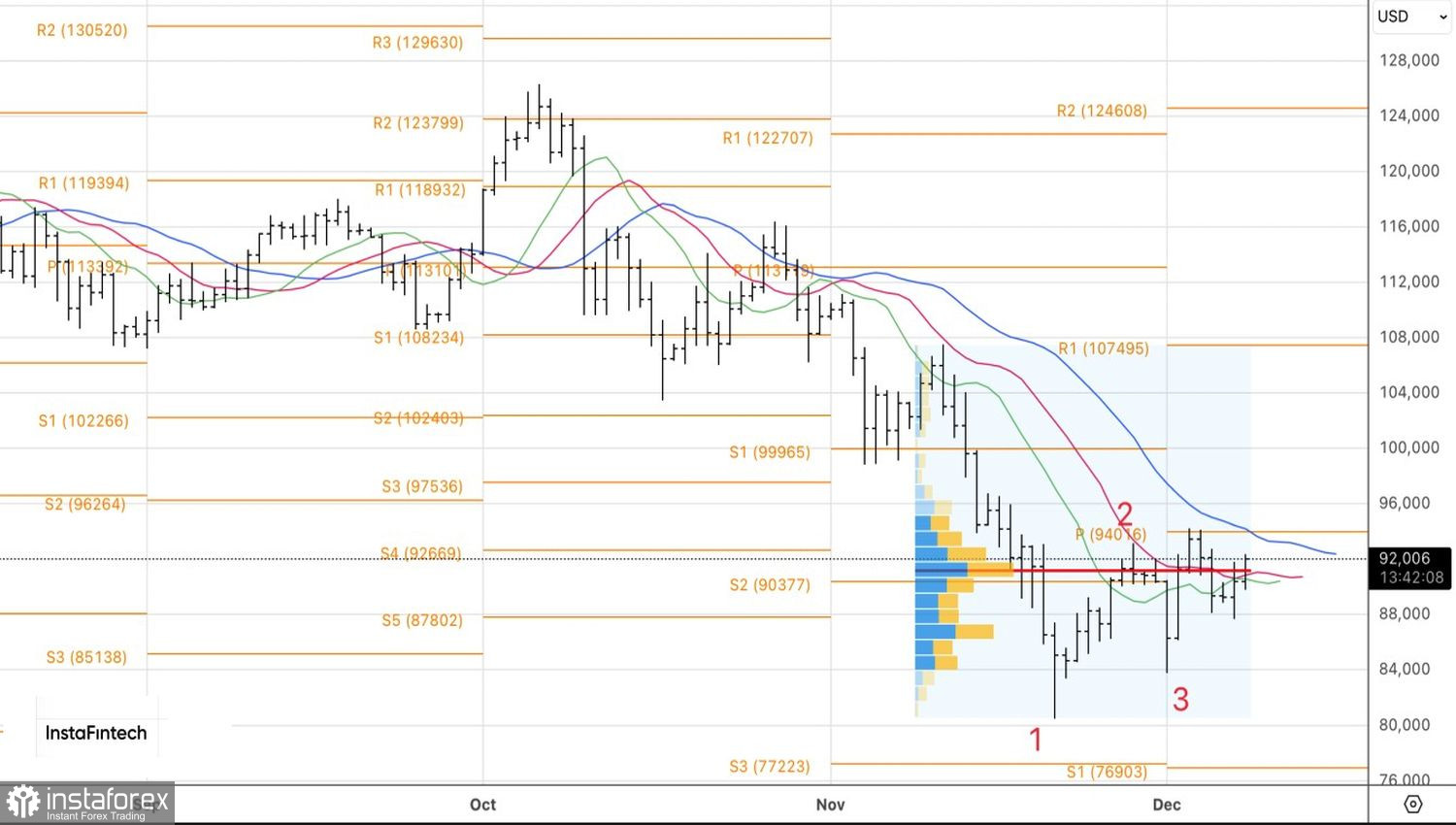Технически на дневном графике BTC/USD «быки» пытаются отыграть разворотный паттерн 1-2-3. Если у покупателей получиться взять штурмом сопротивления вблизи пивот-уровней на 92700 и 94000, шансы на завершение отката возрастут, а у трейдеров появятся точки для входа в длинные позиции по биткойну.