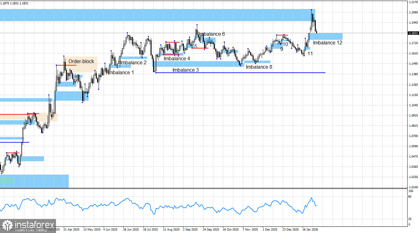 Графическая картина продолжает сигнализировать о «бычьей» доминации. «Бычий» тренд сохраняется, несмотря на горизонтальное движение во второй половине прошлого года. Был образован «бычий» сигнал в имбалансе 11, а чуть позже – новый имбаланс 12. Теперь трейдерам следует ожидать нового сигнала на покупку в имбалансе 12 или же инвалидации этого паттерна. Во втором случае падение пары будет продолжено.