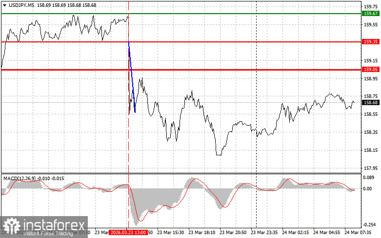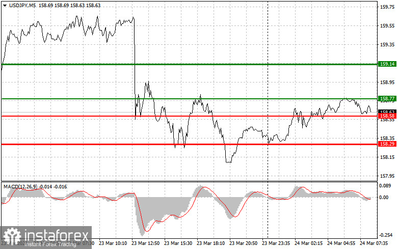 Сценарий №2: покупать USD/JPY сегодня также планирую в случае двух подряд тестов цены 158.58 в момент, когда индикатор MACD будет находиться в области перепроданности. Это ограничит нисходящий потенциал пары и приведет к обратному развороту рынка вверх. Можно ожидать рост к противоположным уровням 158.77 и 159.14.