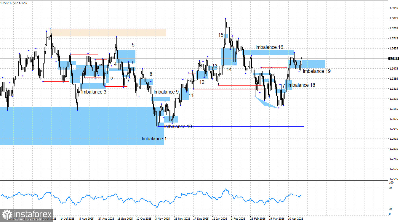 По британцу долгосрочная картина остается «бычьей». «Three drives pattern» предупредил трейдеров о возможном росте, а затем был образован «бычий» имбаланс и «бычий» сигнал. Цена произвела съем ликвидности с «бычьих» свингов от 10 и 23 марта, съем ликвидности со свинга от 26 февраля, но медведи не перешли в атаку ни в первом, ни во втором случае. И это еще один плюс для британца – трейдеры находятся в «бычьем» настроении. Таким образом, в текущих обстоятельствах, несмотря на геополитику, я считаю, что процесс роста будет продолжен. Вероятнее всего, европейская валюта также продолжит рост. Целью для британца я считаю пик 2026 года. Реакция на имбаланс 16 вызвала коррекционный откат, но реакция на имбаланс 19 даст трейдерам новый сигнал на покупку.